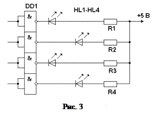 Частота генератора определяется формулой f = 1 / ( 2RC ). Пользуясь этим соотношением легко определить номиналы R и C для получения заданной частоты. Для наших целей частота генератора должна быть в пределах 0,5 – 5 Гц, следовательно R = 100 – 1100 Ом, и C = 1000 мкФ. Б.И. - блок индикации. Для индикации состояний триггеров использованы светодиоды. Смысл индикации состоит в том, чтобы визуально регистрировать уровень логической 1 на выходе триггера. Для этой цели можно использовать ту же микросхему, что и в генераторе К155ЛА3, но лучше применить специально разработанную для работы с индикаторами микросхему К155ЛА8. Она представляет собой ИС ТТЛ с открытым коллектором и повышенной нагрузочной способностью. Схема такого индикатора приведена на рис. 3.