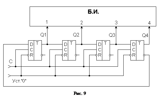 Счетчики Джонсона представляют собой разновидность кольцевых регистров сдвига. Они также строятся на D-триггерах, но цепочка из n триггеров имеет не n, а 2n состояний. Единственное различие между кольцевым регистром сдвига и счетчиком Джонсона состоит в том, что вход регистра сдвига соединен не с выходом Q последнего триггера, а с выходом Q (рис. 9). Это, естественно, приводит к различию в действии обоих устройств: 1. Вместо "перескакивания" с каждым тактовым импульсом единицы из триггера в триггер здесь единичное состояние принимает очередной триггер, и так - в течение первых n импульсов. 2. По достижении единичного состояния всеми триггерами счетчика Джонсона в течение следующих n тактовых импульсов будет происходить "заполнение" триггеров нулями. По достижении всеми триггерами нулевого состояния описанный цикл работы счетчика повторяется.