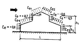 | 1. При расчете поперечных рам зданий с фонарем и ветроотбойными щитами значение суммарного коэффициента лобового сопротивления системы «фонарь-щиты» принимается равным 1,4.