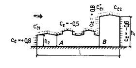 | Коэффициенты с’е1, с’’е1 и се2 следует определять в соответствии с указаниями к схеме 2, где при определении се1 за h1 необходимо принимать высоту наветренной стены здания.