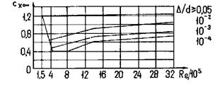 | 1. Re следует определять по формуле к схеме 12,а, принимая z = h, d – диаметр сооружения. Значения Δ принимают для деревянных конструкций Δ = 0,005 м; для кирпичной кладки Δ = 0,01 м; для бетонных и железобетонных конструкций Δ = 0,005 м; для стальных конструкций Δ = 0,001 м; для проводов и тросов диаметром d Δ = 0,01d; для ребристых поверхностей с ребрами высотой b Δ = b.