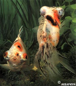 Примечательным признаком всех вуалехвостах телескопов являются сильно расширенные, удлиненно-цилиндрические глазные яблоки. Ни форма, ни величина глаз не всегда симметричны, иногда только один глаз напоминает телескоп, а второй — обычный. Их выступающие глаза могут быть повреждены еще на стадии развития, иногда просто откушены. Очень уязвимая селекционная форма золотой рыбки.