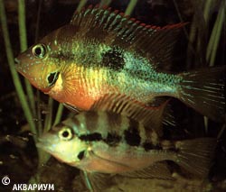 Рыба не для начинающих аквариумис-тов. Грунт мелкого галечника, круглые камни, отдельные коряги и грубые растения как в качестве укрытий для разграничения территорий, так и для нерестилищ. Открытый нерест; икра почти всегда приклеивается на листья. Выклюнувшихся мальков переносят в ямки. Даже более крупных рыб изгоняют с участка.