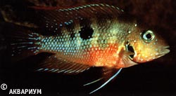 Броско окрашенная в серо-голубой цвет, с черными поперечными полосами рыба. Часто очень драчливая, которую можно содержать и в смешанном аквариуме. Обращает на себя внимание блестящая чешуя от медно-красного до золотистого цвета в области груди у самок.