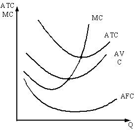 Так как величина постоянных издержек не зависит от объема производства, то конфигурация кривой AFC имеет нисходящий характер, что свидетельствует о том, что с ростом объема производства сумма постоянных издержек приходится на все возрастающее количество единиц продукции (рис.). Кривые AVC и ATC имеют U-образную конфигурацию. По мере расширения производства издержки снижаются, но потом, в силу действия закона убывающей отдачи, вырастают (увеличение числа работников при постоянном капитале сопровождается снижением продуктивности труда, вызывая рост средних издержек).