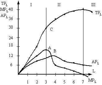 На 3 этапе, когда количество рабочих становится избыточным по отношению к фиксированному капиталу (станки), МР приобретает отрицательное значение, поэтому ТР начинает снижаться. Конфигурация кривой среднего продукта АР также обусловлена динамикой кривой МР. На 1 этапе обе кривые растут, пока приращение объема выпуска от вновь нанятых рабочих будет большим, чем средняя производительность (АРL) ранее нанятых рабочих. Но после точки А (max MP), когда четвертый рабочий добавляет к совокупному продукту (ТР) меньше чем третий, МР уменьшается, поэтому средняя выработка четырех рабочих также сокращается.