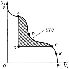 Принцип ПаретоПарето предложил считать, что состояние А предпочтительнее состояния G, если хотя бы для одного индивида состояние А приносит больший уровень полезности, чем состояние G, не снижая уровень полезности ни у одного из остальных индивидов.1 Таким образом, при переходе из состояния А в состояние G никто ничего не теряет, а кто-то что-то и выигрывает. Состояние А определяется как парето-предпочтительное (лучшее) по сравнению с G, а состояние G соответственно как парето-худшее по сравнению с А. Отсюда переход из состояния G в состояние А называется парето-улучшением, а обратный переход - парето-ухудшением. Таким образом, концепция Парето, во-первых, базировалась на разработанной им порядковой теории полезности и, во-вторых, не предполагала межперсональных сравнений уровня полезности, а ограничивалась обычным ранжированием индивидами собственных предпочтений. Выработанный критерий сопоставления состояний выводит на определение экономической эффективности (парето-эффективности). Парето-эффективное состояние обладает тем свойством, что никакое иное достижимое размещение благ не может повысить уровень полезности ни для одного из индивидов без того, чтобы понизить его для кого-нибудь другого. Подчеркнем, что состояние является парето-эффективным, если по отношению к нему не существует возможное парето-предпочтительное состояние. Соответственно, состояние называется парето-неэффективным, если по отношению к нему существует парето-предпочтительное состояние. Рассмотрим рис. 1. Здесь по оси абсцисс показана полезность одного из потребителей, скажем, Андрея. По оси ординат - полезность другого, назовем его Борисом. Область - это область потребительских возможностей. Она включает в себя и свою границу с правой стороны, так называемую кривую возможных полезностей. Андрей и Борис могут потребить любой набор благ в пределах их наличного количества, при этом они могут оказаться как в эффективном состоянии ("выжать" всю возможную полезность и оказаться в какой-либо точке на кривой возможных полезностей), так и в неэффективном, т. е. недобрать потенциально достижимую полезность, а значит, оказаться левее кривой возможных полезностей, предположим, в точке G.