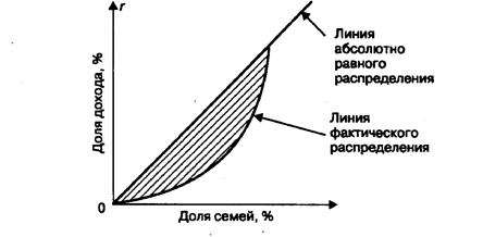 Теоретическая возможность абсолютно равного распределения дохода представлена биссектрисой, которая указывает на то, что любой данный процент семей получает соответствующий процент дохода. Это значит, что если 20, 40, 60% семей получают соответственно 20, 40, 60% от всего дохода, то соответствующие точки будут расположены на биссектрисе. Кривая Лоренца представляет собой кумулятивное распределение численности населения и соответствующих этой численности доходов. В результате она показывает соотношение процентов всех доходов и процентов всех их получателей. Если бы доходы распределялись равномерно, т.е. 10% получателей имели бы десятую часть доходов, 50% — половину и т.д., то такое распределение имело бы вид линии равномерного распределения. Неравномерное распределение характеризуется кривой Лоренца, т.е. линией фактического распределения, отстоящей от прямой тем дальше, чем больше дифференциация. Например, 20% населения с самыми низкими доходами получили 5% общего дохода, 40% с низкими доходами — 15%и т.д.