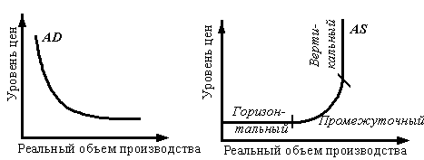 Совокупный спроспоказывает реальный объем национального производства, который потребители, предприятия и правительство готовы купить при любом возможном уровне цен. Кривая совокупного спроса указывает на обратную, или отрицательную, зависимость между уровнем цен и реальным объемом национального производства (рис.). Характер кривой совокупного спроса (AD) определяется тремя факторами: эффектом процентной ставки; эффектом богатства, или реальных кассовых остатков; эффектом импортных закупок. Эффект процентной ставки показывает, что при повышении уровня цен повышаются и процентные ставки, а возросшие процентные ставки приводят к сокращению потребительских расходов и инвестиций. Это, в свою очередь, вызывает сокращение спроса на реальный объем национального продукта. Эффект богатства, или реальных кассовых остатков выражается в том, что при более высоком уровне цен реальная стоимость или покупательская способность материальных ценностей (деньги на срочных счетах, облигации с фиксированной денежной стоимостью) уменьшается и, следовательно, население беднеет и будет сокращать свои расходы. И, наоборот, при снижении уровня цен реальная стоимость материальных ценностей возрастает и расходы увеличатся. Эффект импортных закупок предполагает, что при повышении уровня цен по сравнению с ценами за рубежом эффект импортных закупок приводит к уменьшению совокупного спроса на отечественные товары (услуги). И наоборот, уменьшение уровня цен способствует сокращению импорта и тем самым увеличению чистого экспорта в совокупном спросе. Следует отличать изменения совокупного спроса, вызванные изменением в уровне цен, от тех, которые вызваны изменениями в неценовых факторах совокупного спроса. К последним относятся изменения в потребительских, инвестиционных, государственных расходах, чистых объемов экспорта. Совокупное предложение отражает размеры создаваемого национального продукта и порождаемое данными масштабами воспроизводства изменение цен. Форма кривой совокупного предложения (AS) при этом фиксирует изменение уровня удельных издержек при производстве той или иной величины ВНП, зависит от приоритетов и «кризисных точек» экономического роста, от уровня производства, ниже которого наступает стремительный распад хозяйственной системы. Кривая АS показывает реальный объем национального производства, который будет произведен при различных уровнях цен. Она состоит из трех отрезков: 1) горизонтального (или кейнсианского), когда национальный продукт изменяется, а уровень цен остается постоянным; 2) вертикального (или классического), когда национальный продукт остается постоянным на уровне «полной занятости», а уровень цен может изменяться; 3) промежуточного, когда изменяются и реальный объем национального производства, и уровень цен.