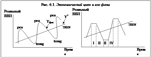 . Экономический цикл и его фазы Экономический (или деловой) цикл (business cycle) представляет собой периодические спады и подъемы в экономике, колебания деловой активности. Эти колебания нерегулярны и непредсказуемы, поэтому термин «цикл» достаточно условный. Выделяют две экстремальные точки цикла: 1)точку пика (peak),соответствующую максимуму деловой активности; 2) точку дна (trough), которая соответствует минимуму деловой активности (максимальному спаду).