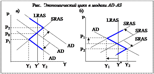 На данном рис. Цикл представлен графически с помощью модели AD-AS. На рис.(а) показан экономический цикл, обусловленный изменениями совокупного спроса (совокупных расходов), а на рис.(б) – изменениями совокупного предложения (совокупного выпуска). В условиях, когда спад в экономике вызывается не сокращением совокупного спроса (совокупных расходов), а уменьшением совокупного предложения, большинство показателей ведут себя так же, как и в первом случае (реальный ВВП, уровень безработицы, величина совокупных доходов, запасы фирм, объем продаж, прибыль фирм, налоговые поступления, объем трансфертных выплат и др.) Исключение составляет показатель общего уровня цен, который повышается по мере углубления спада (рис.б). Это ситуация «стагфляции» - одновременного спада производства (от Y* до Y1) и роста уровня цен (от Р0 до Р1). Основу для выхода из подобного спада также составляют инвестиции, так как они увеличивают запас капитала в экономике и создают условия для роста совокупного предложения (сдвиг кривой SRAS1 вправо до SRAS0).