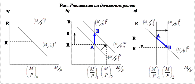 Предложение денег контролирует центральный банк, поэтому можно изобразить кривую предложения денег как вертикальную, т.е. не зависящую от ставки процента (М/Р)S. Спрос на деньги отрицательно зависит от ставки процента, поэтому он может быть изображен кривой, имеющей отрицательный наклон (М/Р)D. Точка пересечения кривой спроса на деньги и предложения денег позволяет получить равновесную ставку процента R и равновесную величину денежной массы (М/Р) (рис.а).