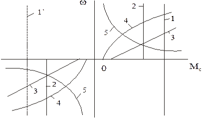 Для теории и практики эл.привода большое значение имеют понятия механической характеристики рабочей машиныw=f(Mc) или Mc=(w). Механические характеристики являются одним из основных критериев при выборе типа двигателя для исполнительного механизма. Различные производственные механизмы имеют различные механические характеристики. Аналитически многие из них можно выразить одной формулой Бланка: Mc=M0+(Mсн-M0)(w/wн)х , где Мс и Мсн статические моменты сопротивления механизма соответственно при скорости w и wн; Мо – момент холостого хода (трения) механизма, не зависящий от скорости. Механические характеристики производственных механизмов можно разделить на следующие классы: 1. Не зависящие от скорости (см. график). При этом Х=0 и ее уравнение Мс=Мсн. Такой характеристикой обладают механизмы, служащие для подъема груза, или механизмы, в которых сопротивление движению оказывают силы сухого трения. Сила тяжести как при подъеме, так и при спуске груза направлена в одну и туже сторону – в сторону спуска и неизменна по значению. Механическая характеристика в этом случае имеет вид прямой1.Мс в этом случае зависит от массы груза: Мс=GR=mgR и может изменяться в пределах от Мс=0 (G=0) до Мс=Мсн(G=Gном).