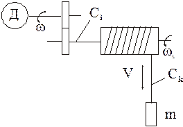 Аналогично выполняется приведение масс, движущихся поступательно со скоростью V, к расчетной скорости w. Заменим, например, систему подъемника, изображенную на рис., эквивалентной системой, содержащей только вращающиеся элементы.