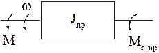 Обычно значительная часть производственных механизмов работает при небольшой скорости рабочих органов (100-300 об/мин.), в то время как двигатели исходя из экономических соображений конструируются на скорости 750-3000 об/мин. Поэтому между двигателем и механизмом размещается передаточное устройство (редуктор), отдельные элементы которого движутся с различными скоростями. Кинематическая схема эл.привода дает представление о кинематических связях между движущимися массами конкретной установки, однако она не отражает того, что инерционные массы движутся с разными скоростями, поэтому момент инерции J отдельных вращающихся элементов или поступательно движущиеся массы ”m” непосредственно сравнивать невозможно, так же как сложно определять (сравнивать) силы и моменты, действующие в движущихся с разными скоростями элементах. Кроме того, кинематическая схема не отражает того обстоятельства, что все элементы системы при нагружении испытывают деформации, т.к. обладают жесткостью. Поэтому при практических расчетах с помощью кинематической схемы составляется расчетная схема механической части эл.привода, в которой Мс, Fc, J, m, а также реальные жесткости “С” механических связей заменяются эквивалентными величинами, приведенными к одной расчетной скорости. Обычно за нее принимается скорость вала двигателя. При замене реальной системы эквивалентной, приведенной системой все J, Mc, Fc, j, m и С должны быть пересчитаны таким образом, чтобы сохранились кинетические и динамические свойства исходной системы, т.е. необходимо обеспечить сохранение запаса кинетической и потенциальной энергии системы, а также элементарной работы всех действующих в системе сил и моментов на возможных перемещениях. Если система эл.привода состоит из нескольких инерционных элементов (см. рис.), имеющих моменты инерции J1,J2,…Jn, вращающихся с угловыми скоростями w1,w2,...wn, и параметры системы таковы, что влиянием упругих связей можно пренебречь, их динамическое действие можно заменить действием одного момента инерции Jпр, приведенного к расчетной скорости (валу двигателя). Под ним понимают момент инерции простейшей системы, состоящей только из элементов, вращающихся со скоростью оси, к которой производится приведение, и которая обладает