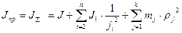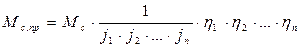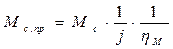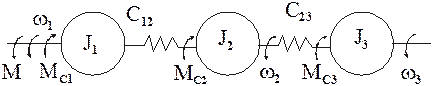 Здесь J1,J2,J3 – суммарные приведенные моменты инерции, образованные приведенными массами, связи между которыми приняты жесткими. С12 и С23 – приведенные жесткости упругих связей между J1 и J2, J2 и J3. Инерционная масса J1 включает в себя момент инерции ротора (якоря) двигателя и других элементов, жестко связанных с ним. К этой массе приложен электромагнитный момент М двигателя и момент статической нагрузки Мс1, который обычно является суммарным моментом потерь на валу двигателя и жестко с ним связанных элементах. Инерционная масса J2 является в трехмассовой расчетной схеме промежуточной массой. К ней приложен момент сопротивления Мс2. Инерционная масса J3 в этой схеме представляет суммарный приведенный момент инерции элементов, жестко связанных с рабочим органом механизма. К ней приложен момент внешней нагрузки этой массы Мс3. В двухмассовой расчетной схеме J1 – это суммарный приведенный момент инерции ротора (якоря) двигателя и других элементов, жестко связанных с двигателем, а J2 суммарный приведенный момент инерции элементов, жестко связанных с рабочим органом механизма. Упругая связь между J1 и J2 характеризуется эквивалентной жесткостью С12. Суммарные моменты сопротивления на валу двигателя и механизма – Мс1 и Мс2. Обычно 3-х массовая расчетная схема используется для детального анализа условий движения механизма. Для исследования отдельных физических особенностей 3-х массовая расчетная схема сводится к 2-х массовой. Электромеханическая система с 2-х массовой упругой механической частью представляет собой простейшую модель электропривода, наиболее удобную для изучения влияния упругих связей. В тех случаях, когда влияние упругих связей незначительно или при решении задачи ими можно пренебречь, механическая часть электропривода представляется простейшей расчетной схемой (см. рис.) – жестким приведенным механическим звеном, т.е. многомассовая механическая часть эл.привода с моментами инерциями J1 ,J2 и т.д. заменяется действием одного момента инерции Jnp, приведенного к расчетной скорости. Суммарный приведенный момент инерции эл.привода в этом случае определяется как J – момент инерции двигателя; n, k – число элементов установки, совершающих соответственно вращательное и поступательное движение. Суммарные приведенный к валу двигателя момент статического сопротивления в общем виде можно представить как: p,q – число внешних моментов Мi и сил Fj, приложенных к системе кроме электромагнитного момента двигателя. Кинематические схемы многодвигательных эл.приводов приводят к разветвленным расчетным схемам. Приведенные выше формулы для определения приведенных Mc, Fc не учитывают КПД отдельных передач или механизма в целом. С учетом КПД механизма При наличии между двигателем и механизмом нескольких передач с передаточными отношениями j1,j2 и т.д. При передаче энергии от рабочего органа механизма к двигателю (в случае активного момента сопротивления):