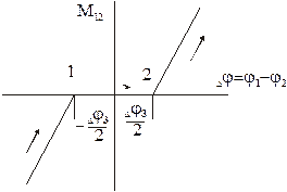 Динамические нагрузки механического оборудования значительно возрастают из-за ударов, возникающих при выборе зазоров в передачах и сочленения машин. С учетом кинематических зазоров расчетная схема 2-х массовой упругой механической системы может быть представлена в следующем виде: При наличии зазора Dj3 зависимость момента М12 упругого взаимодействия Уравнения движения в этом случае запишутся в виде: