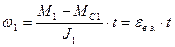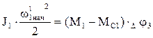 Это уравнение соответствует наиболее тяжелому случаю выбору полного зазора, когда начальное значение Dj соответствует точке 1 (см. зависимость После выбора зазора инерционная масса J2 будет оставаться еще неподвижной. Начнется деформация (закручивание) упругих элементов под действием момента М12.Это будет продолжаться до тех пор, пока М12, возрастая, не превысит МС2. За время нарастания М12 до МС2 скорость инерционной массы J1 дополнительно увеличивается до w1нач.. Т.к. инерционные массы механизма при этом неподвижны, процесс выбора зазора заканчивается упругим ударом, при котором запасенная во вращающихся с угловой скоростью w1нач. массах J1 кинетическая энергия Умножая 1-е уравнение на