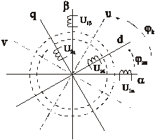 В осях x,y реальные переменные напряжения, приложенные к статору преобразуются в постоянное напряжение U1макс=const, приложенное только к обмотке, расположенной на оси х. Действительно, пусть к реальным обмоткам статора приложена симметричная система напряжений Если с помощью формул прямого преобразования преобразовать U1a и U1b в соответствующие им напряжения U1x и U1y и учесть, что wк=wэл, получим: