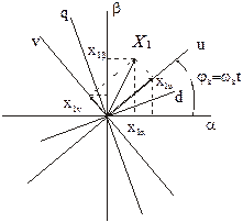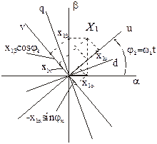 Как реальные переменные Х1a, Х1b, так и преобразованные Х1u и Х1v , являются проекциями на соответствующие оси одного и того же результирующего (обобщенного) вектора Х. Переход от преобразованных, т.е. фиктивных переменных к реальным переменным обобщенной машины осуществляется с помощью формул обратного преобразования, которые можно получить с помощью аналогичных построений (см. рис.).