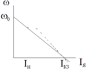 На вид естественных механической и электромеханический характеристик значительное влияние оказывает реакция якоря, т.к. даже при наличии КО она полностью компенсируется только при номинальной нагрузке. Вследствие реакции якоря при росте нагрузки (тока) поток машины уменьшается и наоборот. В результате с ростом нагрузки (тока) момент двигателя растет не пропорционально току, а в меньшей степени, что вызывает отклонение характеристик от линейных (см. пунктирные характеристики на рис.). В механических характеристиках из – за размагничивающего действия реакции якоря могут появляться участки с положительной жесткостью (см. “а-б” на графике). Сказывается явление опрокидывания регулирования. Это может привести к неустойчивой работе электропривода. Реакция якоря, кроме того, уменьшает перегрузочную способность двигателя. Так, при токе, допустимому по условиям коммутации, поток двигателя снижается на10-20%, пропорциональность между Iя и М нарушается и перегрузочная способность двигателя без КО при прочих равных условиях ниже, чем у двигателей с КО. Реакция якоря неблагоприятно сказывается и на динамических свойствах эл.привода. Поэтому в двигателях без КО мощностью до 100кВт применяются стабилизирующие обмотки, размещаемые на сердечниках главных полюсов. Они включаются цепь якоря последовательно и создают небольшую МДС, компенсирующую действие реакции якоря. Но двигатели с такими обмотками нельзя применять для реверсивных эл.приводов, т.к. при изменении направления вращения ток якоря имеет противоположное направление и стабилизирующая обмотка будет усугублять действие реакции якоря, ибо ее МДС будет действовать против МДС основных полюсов.