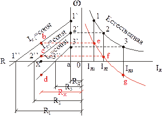 Для построения искусственных характеристик в I квадранте строится естественная электромеханическая характеристика двигателя. По оси абсцисс влево от начала координат откладывается сопротивление цепи якоря. Во II квадранте проводится вертикальная линия отстоящая от начала координат на расстояние (0а), соответствующее в масштабе сопротивлений, сопротивлению двигателя Задаваясь некоторым значением тока IЯ1, проводится вертикаль до пересечения с естественной характеристикой в т.1. После этого в осях w и R ищут прямую Откладывая на оси абсцисс значения этого сопротивления, получим т.1``. Соединяя прямой точки 1` и 1``, получим искомую зависимость