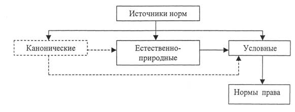 Рис. 1.1. Классификация норм по источнику происхождения нормы канонические (религиозные), имеющие Божественное происхождение и являющиеся общеобязательными в случае объединения религии и государства. Такие нормы широко применялись в средние века и формировали каноническое право. Элементы канонического права имелись в законодательстве Российской Империи. В светском государстве, к которому относится современная Россия, канонические нормы не имеют прямой связи с правовыми нормами. Религиозные каноны добровольно принимаются верующими в качестве обязательных для себя норм поведения и формируют преобладающую в обществе идеологию и мораль. Канонические нормы исторически сформировали многие нормы права (например, заповеди «неубий!», «не укради! »}\ нормы естественно-природного характера (например, физические, биологические, математические), имеющие абсолютное действие и не зависящие от воли людей. Например, действие закона сохранения материи академика М.В. Ломоносова, или правила арифметики никак нельзя отменить, изменить или игнорировать. Естественно-природные нормы являются общеобязательными в силу неотвратимости их действия, гарантируемого Природой. Поэтому естественно-природные нормы не могут быть предметом их регулирования человеком. нормы условные, происходящие из сложившихся обычаев, традиций, опыта, желаний и определяемые волей людей, их договоренностью. Условные нормы создаются человеком в процессе его деятельности. К таким нормам относятся и правовые нормы, поскольку право создается человеческим обществом. Примером условных норм, имеющих правовое значение, является введение в России правостороннего дорожного движения транспортных средств, хотя в ряде стран введено левостороннее движение, что как раз и подтверждает условный характер такой нормы. Важнейшей гарантией обязательности условных норм является обеспечение их действия соответствующими нормами права. Например, для того чтобы действовали санитарные нормы, определяющие опасные концентрации микроорганизмов и вредных веществ, или технические нормы, определяющие допустимые деформации кузова автомобиля при столкновениях, необходимо создать правовые гарантии обязательности применения таких норм. Это достигается введением соответствующих норм права. Так, при нарушении указанных санитарных норм наступают правовые последствия для нарушителей, принуждающие их к исполнению предписанных требований. При невыполнении норм, установленных для прочности кузова, автомобиль не получит сертификат одобрения типа транспортного средства и не будет допущен к государственной регистрации, а значит, и к эксплуатации на дорожной сети общего пользования. Условные нормы, в отношении которых не установлены соответствующие обеспечивающие их действие нормы права, не могут быть признаны обществом обязательными. Такие нормы будут иметь применение в добровольном порядке. Примерами подобных норм являются требования систем добровольной сертификации услуг, добровольного страхования. Обязательность действия различных условных норм (назовем их специальными нормами) устанавливают нормы права, обеспечивающие функции организации применения и действия специальных норм. Действительно, именно благодаря нормам права в транспортном комплексе действуют и выполняют