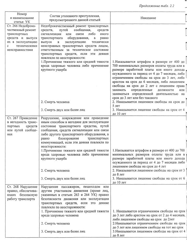 РЕГУЛИРОВАНИЕ ТРАНСПОРТНЫХ ОТНОШЕНИЙ УГОЛОВНЫМ ПРАВОМУголовное право - отрасль права, в которой устанавливаются принципы уголовной ответственности, определяются преступления и порядок применения наказаний за совершение преступлений. Из всех фундаментальных отраслей права уголовное право является самым систематизированным. Нормы уголовного права систематизированы в Уголовном кодексе (УК) Российской Федерации. В ст.1 УК указано, что данный кодекс является единственным источником уголовного права России. Он предусматривает, среди прочих мер ответственности, ответственности за различные преступления против безопасности движения и эксплуатации транспорта. Смежные с уголовным правом задачи уголовного судопроизводства решаются уголовно-процессуальным кодексом РФ. Уголовное наказание может быть наложено исключительно судом. Уголовному наказанию может быть подвергнуто только физическое лицо. Если уголовное преступление было сопряжено с ненадлежащим исполнением профессиональной деятельности, ответственность за его совершение понесут работники транспортной организации. В первую очередь это касается водителей транспортных средств и другого линейного персонала (например, кондуктор автобуса, не обеспечивший безопасную посадку пассажиров через контролируемую им дверь), руководителей и специалистов транспортных предприятий и должностных лиц, осуществляющих функции, связанные с обеспечением безопасности движения и перевозок. Уголовный кодекс содержит главу 27 «Преступления против безопасности движения и эксплуатации транспорта», в которой имеется девять статей (табл.2.2). Следует указать также на статьи, связанные с преступными действиями, непосредственно направленными на транспортное средство: ст. 166 «Неправомерное завладение автомобилем или иным транспортным средством без цели хищения»; ст. 211 «Угон судна воздушного или водного транспорта»; ст. 227 «Пиратство»; ст. 326 «Подделка или уничтожение идентификационного номера транспортного средства». Неправомерное завладение транспортным средством или иным имуществом квалифицируется как кража, мошенничество, грабеж или разбой в зависимости от характера противоправных действий (соответственно статьи 158,159, 161, и 162 УК). Некоторые статьи УК устанавливают составы преступлений, при которых транспортное средство непосредственно может использоваться при нанесении вреда жизни, здоровью, имуществу людей, имуществу организаций и окружающей среде: ст. 143 «Нарушение правил охраны труда»; ст. 219 «Нарушение правил пожарной безопасности»; ст. 236 «Нарушение санитарно-эпидемиологических правил»; ст. 237 «Сокрытие информации об обстоятельствах, создающих опасность для жизни или здоровья людей»; ст. 238 «Выпуск или продажа товаров, выполнение работ или услуг, не отвечающих требованиям безопасности»; ст. 246 «Нарушение правил охраны окружающей среды при производстве работ»; ст. 250 «Загрязнение вод»; ст. 251 «Загрязнение атмосферы». В основном эти статьи УК действуют, как бланкетные, поскольку предполагают отсылку к соответствующим правилам. В качестве примера можно рассмотреть действие ст. 219 УК «Нарушение правил пожарной безопасности». Правовой основой для разработки правил пожарной безопасности служит Федеральный закон «О пожарной безопасности». «Правила пожарной безопасности 