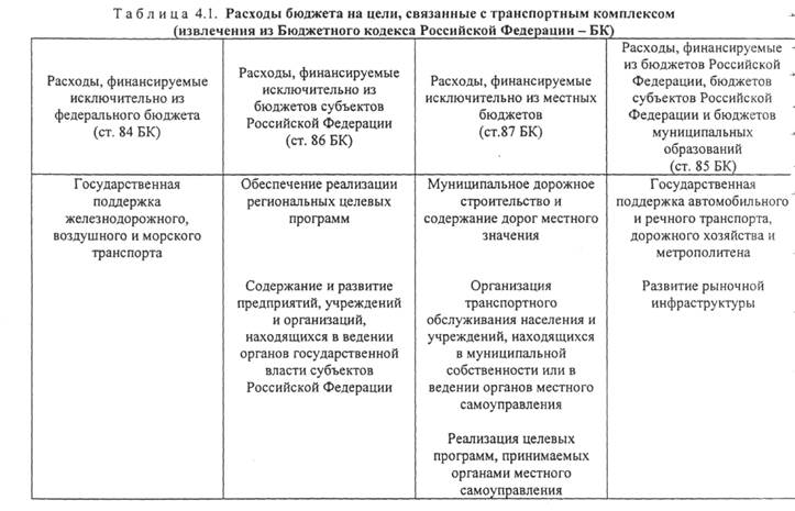 ГОСУДАРСТВЕННЫЕ И МУНИЦИПАЛЬНЫЕ ЗАКАЗЫ НА ТРАНСПОРТНЫЕ УСЛУГИ И РАБОТЫОсобенностью государственных заказов на транспортные услуги и работы с использованием транспорта является то, что заказчиком по соответствующим договорам выступает орган исполнительной власти, казенное предприятие или государственное учреждение. Такой заказчик именуется государственным заказчиком. Соответственно на уровне местного самоуправления стороной в договоре может быть муниципальный заказчик. Финансовой особенностью государственного и муниципального заказа является использование для расчетов за оказанные услуги и выполненные работы средства бюджета соответствующего уровня или средств внебюджетных фондов. Порядок предъявления и исполнения государственного заказа определяется номами гражданского и бюджетного права, специальными законами по конкретным вопросам государственного заказа. Правовая основа муниципальных заказов дополняется законами субъектов Российской Федерации и актами органов местного самоуправления, принятыми по вопросам муниципальных заказов. Договор государственного (муниципального) заказа оформляется государственным (муниципальным) контрактом. Первым законодательным актом, регулирующим порядок государственного заказа, стал Закон Российской Федерации «О поставках продукции и товаров для государственных нужд». Наиболее разработаны нормы, регулирующие поставки продукции и выполнение подрядных работ для удовлетворения государственных нужд. Основные положения таких норм применяют к услугам. Актуальным является разработка законодательного акта, в котором будут установлены нормы оказания транспортных услуг в порядке удовлетворения государственных и муниципальных потребностей. Целесообразно ввести в разрабатываемый ныне кодекс автомобильного транспорта соответствующий раздел. Согласно ст.ЗЗ Федерального закона «Об общих принципах организации местного самоуправления в Российской Федерации» органы местного самоуправления могут выступать заказчиком на выполнение в порядке муниципального заказа различных работ по благоустройству территории муниципального образования, коммунальному обслуживанию населения, оказанию услуг для удовлетворения бытовых и социально-культурных потребностей населения, на выполнение других работ с использованием предусмотренных для этого собственных материальных и финансовых средств. На практике применительно к транспортной деятельности предметом муниципального заказа является оказание услуг городского пассажирского транспорта на муниципальных маршрутах, вывоз мусора и бытовых отходов, автотранспортное обслуживание учреждений (местного самоуправления, медицинских, коммунальных служб) и т.п. При осуществлении финансирования работ и услуг, выполняемых в порядке реализации государственного и муниципального контракта большое значение имеет правильное использование бюджетных средств. Федеральным законом «Бюджетный кодекс Российской Федерации» (№ 145-ФЗ от 31.07.98) установлены допустимые направления расходования средств различных бюджетов. Анализ этих направлений позволил выделить «транспортную составляющую» бюджетных расходов (табл. 4.1). Формирование государственных и муниципальных заказов на транспортные услуги и работы с использованием транспор