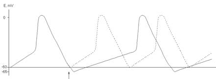 Рис.16. Учащение ритма возбуждения в клетках синоатриального узла под влиянием симпатического нерва. Момент раздражения обозначен стрелкой. Скорость проведения возбуждения по проводящей системе сердца возрастает. В мембране рабочих кардиоцитов под влиянием норадреналина и адреналина (b-адренорецепторы) также активируется кальциевые каналы. Начинается это с активации фермента аденилатциклазы, что приводит к увеличению внутриклеточной концентрации цАМФ, активации цАМФ зависимой протеинкиназы, которая в свою очередь катализирует фосфорилирование белков ионных каналов, в частности кальциевых. Это вызывает увеличение количества ионов кальция, поступающих в кардиоцит, и возрастание силы сокращения миокарда. Данный эффект сопровождается значительным увеличением потребления кислорода миокардом. Действие медиатора блуждающего нерва ацетилхолинана миокардиоциты осуществляется через М-холинорецепторы (мускарин-чувствительные). При этом снижается частота сердечных сокращений, уменьшается проводимость, сократимость миокарда, а также потребление миокардом кислорода (рис.17). Клеточные механизмы действия ацетилхолина изучены в меньшей степени, чем адреналина и норадреналина. Предполагается, что ацетилхолин, взаимодействуя с мускариновым рецептором, тормозит активность аденилатциклазы, но стимулирует гуанилатциклазу, которая переводит гуанозинтрифосфат (ГТФ) в циклический гуанозинмонофосфат (цГМФ). Последний вызывает активацию калиевыхканалов и увеличение выходящего калиевого тока в клетках водителя ритма. Это приводит к гиперполяризации клеточноймембраны, к уменьшению скорости спонтанной диастолической деполяризации и к урежению частоты генерируемых импульсов. В рабочих кардиоцитах предсердий и желудочков укорачивается фаза реполяризации потенциала действия (фаза “плато”), уменьшается вхождение кальция в клетку и падает сократимость миокарда. В клетках атриовентрикулярного узла и в пучке Гиса ацетилхолин также вызывает гиперполяризацию мембраны, в связи с чем замедляется распространение возбуждения по проводящей системе сердца.