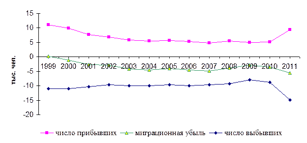 Миграционное движение населения− Сущность миграционных процессов − География миграций населения региона На динамику численности населения региона большое влияние оказывают миграционные процессы. В литературе существует разное понимание сущности миграций. Некоторые исследователи вкладывают в это понятие всё многообразие пространственного перемещения людей (включая «маятниковые миграции» и даже туризм). Однако другая близкая нам точка зрения рассматривает миграции как перемещение населения через границы страны или её административно-территориальных единиц, связанное с переменой постоянного места жительства. В данном определении приняты: 1) пересечение административно-территориальных границ государства, области, населённого пункта и т. п.; 2) перемена постоянного места жительства. Для обозначения передвижения населения также широко используется термин «механическое движение населения». Важнейшая особенность миграций в том, что в отличие от естественного движения они носят территориальный (по сути географический характер). География миграций населения региона. Кировская область устойчиво теряет население в результате миграции. Миграционная убыль заметна даже на фоне других регионов Центральной России и Нечерноземья. Область – лидер по этому показателю в Приволжском федеральном округе. Следует отметить, что регион и раньше характеризовался миграционной убылью. В послевоенные, и особенно в 1960–70-е гг. Кировская область являлась одним из наиболее крупных поставщиков рабочей силы в другие регионы страны. Миграционное сальдо* было отрицательным и, несмотря на естественный прирост, численность населения постоянно уменьшалась. Выезжали преимущественно сельские жители. При этом часть их «оседала» в городских поселениях внутри области, способствуя росту последних. В 80-е гг. интенсивность оттока кировчан за пределы области стала замедляться, а в 90-е гг. приток мигрантов в область превысил их отток. Однако с 2000 г. число выбывших вновь стало превышать число прибывших в область (рис. 2). Основной объём миграции в 2011 г., как и в предыдущие годы, происходил в пределах области (68 %) и с регионами России (30 %). На долю международной миграции пришлось лишь 2 % миграционного оборота. Миграционная убыль увеличивается. В 2011 г.** она составила 5581 чел. (число выбывших с территории области – более 14,9 тыс. чел.). Отрицательное миграционное сальдо отмечается со всеми федеральными округами, кроме прироста в десятки человек в обмене с Дальневосточным, Северо-Кавказским и в отдельные годы Сибирским федеральными округами.
