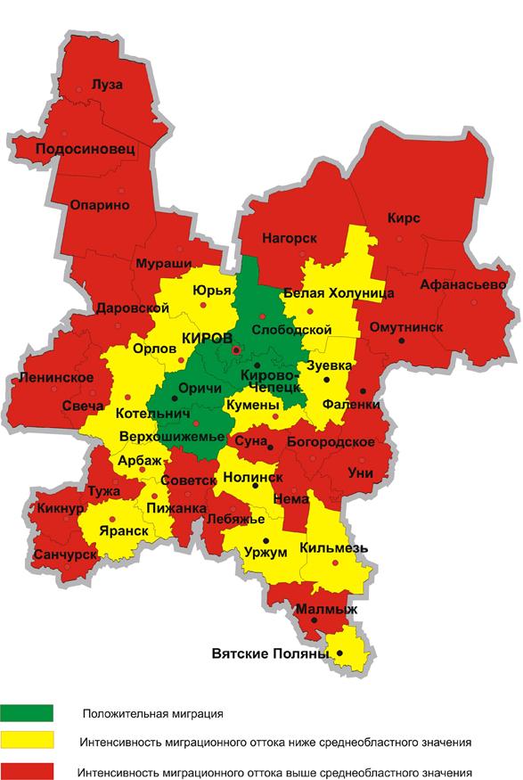 Среди субъектов РФ главные направления выбытия жителей области – Москва, Московская область, Санкт-Петербург, Татарстан. Наиболее заметное положительное миграционное сальдо отмечается с Республикой Коми. После распада СССР резко возросло участие кировчан в международной миграции. В настоящее время число эмигрантов относительно невелико и составило в 2010 г. 124 чел., что на порядок меньше, чем в 1990-е гг. (в «пиковом» 1995 г. – 1851 чел.). Число прибывших из-за пределов России в 2010 г. составило 784 чел., что в десять раз меньше, чем в 1994 г. В отличие от внутрироссийской миграции миграционный баланс с зарубежными странами положительный за счёт обмена с государствами бывшего СССР (в первую очередь Украиной, Азербайджаном, Узбекистаном) и Вьетнамом. Однако миграция из стран СНГ сокращается, способствуя увеличению миграционной убыли в регионе. Неблагоприятным для области является качественный состав мигрантов. В возрастной структуре среди мигрантов по-прежнему преобладают лица в трудоспособном возрасте. Их удельный вес в общем числе выезжающих за пределы области в 2010 г. составил 74 %, наиболее интенсивный отток приходится на возраст 20–29 лет, что также влечет за собой отток детей в возрасте до 10 лет. Актуальна проблема выезда из региона высококвалифицированных кадров. В результате отрицательного сальдо миграции область потеряла в 2010 г. 2 тыс. чел., имеющих образование среднее специальное и высшее. Тенденции, свойственные для Кировской области в целом, в разной степени выражены в районах области. Более 10 лет подряд ежегодная механическая убыль населения отмечалась в 21 муниципальном образовании второго уровня, в том числе в городе Кирово-Чепецке. Наибольшего значения отток населения за период 2000–2010 гг. достиг в Тужинском районе (16,7 % от численности жителей на начало 2000 г.), а также в Афанасьевском (16,2 %) и Даровском (14,9 %). Важно отметить, что миграционная убыль в них сочетается с депопуляцией, старением населения, что усугубляет ситуацию. Миграционный прирост за рассматриваемый период отмечался на нескольких территориях, расположенных в основном в центральной части региона: в Кирове, Вятскополянском, Зуевском, Кирово-Чепецком, Кумёнском, Оричевском (наиболее значительный прирост – 6,5 %), Слободском, Яранском районах. При этом основной прирост в районах приходится на первую половину 2000-х гг. На 2010 г. положительное сальдо миграций отмечено только в областном центре и прилегающем к нему Кирово-Чепецком районе. Привлекательными для населения остаются только районы, прилегающие к зоне формирования Кировской агломерации, что определяется концентрацией здесь наиболее крупных предприятий, относительно развитой инфраструктурой, наличием свободных рабочих мест и возможностью их выбора. Это способствует увеличению трудовых ресурсов в этой зоне на фоне уменьшения по области в целом. Показательно, что, на фоне самого большого среди регионов ПФО сокращения численности населения в межпереписной период, население областного центра всё же увеличилось. С учётом депопуляции, очевидно, что весомый вклад внесла внутриобластная миграция как результат перепада в уровне жизни и «уровне жизнеощущения» между областным центром и сельской местностью. Основной причиной смены места жительства 54 % мигрантов в возрасте 14 лет и старше, выехавших в 2010 г. из региона, у