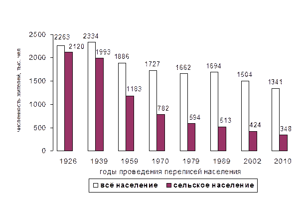 * Данные на 1 января 2012 г. Несмотря на снижение численности городского населения области, доля горожан в населении региона за последние 20 лет увеличилась. Это связано с ещё более высокими темпами сокращения сельского населения. Важным недостатком системы расселения Кировской области является нарастающее гипертрофированное значение областного центра, чрезмерная концентрация в нём социальных, культурных, экономических и других функций. Это в сочетании с неразвитой транспортной сетью затрудняет оказание социальных услуг значительной части населения региона. Города-центры межрайонного значения, способные полностью взять на себя оказание эпизодических услуг в регионе, на наш взгляд, в регионе не сформированы. В такой ситуации возрастает значение районных центров, однако людность большинства из них заметно ниже обозначаемых в районных планировках размеров. Сельское расселение. Сельскими поселениями считаются все поселения, не отвечающие критериям города или пгт. Они могут выполнять как сельскохозяйственные, так и несельскохозяйственные функции. Но, прежде всего, села и деревни – это места жизни людей, ведущих хозяйство на земле, использующих её как главное средство производства. Они образуют как бы сплошную «ткань» освоения территории: между ними проходят дороги, протянуты линии электропередач и пр. Сельское население Кировской области составляет 338,3 тыс. чел. (на 01.01.2012 г.). На его долю приходится 25,5 % населения области. С 20-х гг. прошлого столетия сельское население интенсивно сокращается, что характерно и для других регионов Нечерноземья. В начале XX века Вятская губерния была одной из самых аграрных в европейской России. Преобладающая часть населения проживала в сёлах, деревнях, выселках и других сельских поселениях. Сокращение численности сельских жителей происходило за счёт миграции селян в города и преобразования ряда сельских населённых пунктов в городские, а с 1990-х гг. и естественной убыли, которая у селян немного выше, чем в городах. С 1989 г. численность сельского населения сократилась более чем в 1,5 раза: область – явный лидер в ПФО по темпам снижения сельского населения (рис. 4). Уменьшение численности сельского населения привело к значительному сокращению числа сельских населённых пунктов. Так в 1950 г. их насчитывалось 17159, в 1970 г. – 11250, в 1989 г. – 5675, а к 2011 г. – всего 3248 (с населением). В ряде районов число сельских поселений за 1970–2010 гг. сократилось более чем в пять раз: в Богородском (со 155 до 17), Даровском, Свечинском, Мурашинском, Нагорском, Шабалинском, Котельничском, Белохолуницком, Верхошижемском. Наибольшее сокращение числа сельских поселений происходило в 1960–1970-е гг., чему способствовала не оправдавшая себя политика деления их на «перспективные» и «неперспективные». Считалось, что сравнимые с городскими условия жизни можно обеспечить в крупных поселениях (с числом жителей более 1 тыс.). Туда и надлежало переселяться жителям небольших деревень. Однако миграционные потоки из «неперспективных» поселений стали направляться не в крупные сёла, а в города. В настоящее время подобная политика вновь декларируется в регионе (например, в Стратегии-2020), однако её проведение требует внимательного изучения ситуации, особенно, когда вопрос стоит об определении «неперспективных» поселений. Повторное освоение опустевше