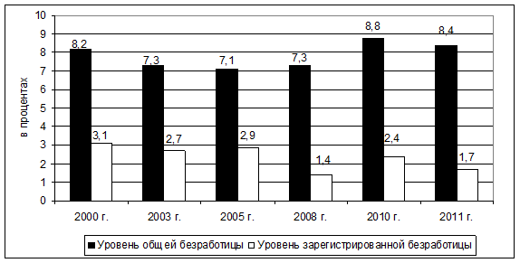 Занятость населения и уровень безработицы. Занятость – это участие населения в трудовой деятельности, включая учёбу, службу в армии, ведение домашнего хозяйства, уход за детьми и пожилыми людьми. Показатели занятости и безработицы характеризуют состояние экономики региона и являются динамичными величинами, изменяющимися под влиянием экономических и демографических факторов. Уровень занятости населения определяется отношением численности занятого населения к предложению рабочей силы. Данные табл. 8 свидетельствуют, что численность занятых снизилась, а уровень занятости увеличился, что обусловлено динамичным развитием экономики в посткризисный период. Претерпела существенные изменения структура занятости населения по отраслям и видам экономической деятельности. До начала перехода к рыночной экономике преобладающая часть рабочей силы была занята в отраслях материального производства. За 1990–2000 гг. среднегодовая численность занятых уменьшилась почти на 100 тыс. чел. Основное сокращение произошло в отраслях производственной сферы: строительстве, промышленности, сельском хозяйстве. В то же время увеличилась доля занятых работников в торговле, на транспорте и связи, органах управления, социального обслуживания населения. Уровень зарегистрированной безработицы во второй половине 1990-х гг. был одним из самых высоких в России, и область входила в десятку «лидеров» по данному показателю. С конца 90-х гг. в экономике региона отмечается рост производства, что ведёт к увеличению занятости в отдельных отраслях и снижению уровня безработицы. Так увеличивается удельный вес занятых в отраслях социальной сферы, особенно в торговле, здравоохранении, на предприятиях связи, в органах финансирования и кредитования, в пенсионном обеспечении. В то же время продолжает снижаться число работающих в промышленности, на транспорте и сельском хозяйстве, а также в науке и научном обслуживании. В 2000-е гг. численность занятых в экономике растёт, а уровень безработицы снижается. До начала мирового финансового кризиса экономика региона развивалась динамично. Среднегодовая численность занятых в 2005–2008 гг. была относительно стабильной (около 715 тыс. чел.). Но особенности демографической ситуации и интенсивные миграции трудовых ресурсов за пределы области привели к нарастающему дефициту трудовых ресурсов. Ежегодно на заработки в более богатые регионы страны выезжали 20–40 тыс. чел. и более. Острый дефицит в кадрах испытывали строительство, лесозаготовки, деревообрабатывающая промышленность и ряд других производств. Уровень зарегистрированной безработицы за 2007–2008 гг. (по данным на конец года) оставался стабильным – 1,4 %, что было ниже среднего показателя по России. Уровень общей безработицы за 2008 г. составил 7,3 % (рис. 5).