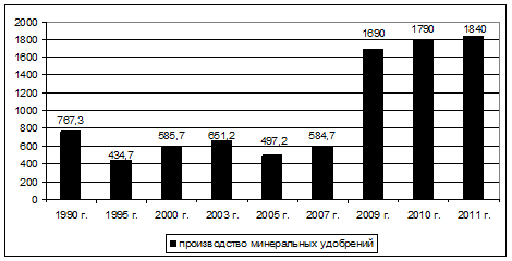Рис. 6. Динамика производства минеральных удобрений в пересчёте на 100 % питательных веществ, тыс. т Более 60 % всей производимой продукции идёт на экспорт. Основные потребители: Китай, страны южной и центральной Африки, Латинской Америки. Повышенную экспортную значимость имеют азотные удобрения и аммиак синтетический, их доля в экспорте составляет соответственно 89,3 % и 25,7 % от общего объёма их производства (2010 г.). Чистая прибыль предприятия за 2011 г. увеличилась в 2,4 раза к уровню 2010 г. ЗМУ КЧХК является главным налогоплательщиком: платежи в областной бюджет составили 2,2 млрд руб. Значительные суммы выделяются на решение социальных проблем Кирово-Чепецка и охрану окружающей среды. В Кирово-Чепецке работает также ООО «Кирово-Чепецкая химическая компания». Она основана в 1997 г. как торговая компания, позднее преобразована в холдинг, состоящий из двух предприятий: «Агрохимикат» и «Кирово-Чепецкая химическая компания». Холдинг специализируется на производстве и реализации химических средств защиты растений (пестицидов): гербицидов (химические вещества, применяемые для уничтожения растительности), инсектицидов (химические средства борьбы с вредными насекомыми), фунгицидов (способны полностью или частично подавлять развитие возбудителей болезни). Продукция реализуется на рынках Кировской области и многих регионов страны. В областном центре работает несколько десятков химических предприятий. Ведущее из них – Кировский шинный завод (КШЗ). Его строительство было обусловлено эвакуацией в 1943 г. шинного производства из г. Ярославля. В первые годы завод работал полностью на военные нужды. В последующее время были освоены десятки новых видов шин, в том числе разработана первая в России технология и создано производство радиальных шин с повышенной проходимостью. В 1990-е гг. огромное значение для КШЗ имела победа в конкурсе на поставку шин для автомобилей «Газель», благодаря чему завод работал относительно стабильно. В 1999 г. КШЗ был приобретён компанией «Амтел-Фредештайн», которая вложила более 40 млн евро на модернизацию производства. Благодаря инвестициям в 2002 г. пущена в действие новая технологическая линия по выпуску высокоскоростных шин проектной мощностью 3 млн шт. в год. В итоге выпуск шин за 2003–2006 гг. увеличился более чем в два раза, и область заняла второе место среди российских регионов по объёмам производства. Но мировой финансовый кризис привёл к снижению спроса на продукцию, и в 2009 г. компания «Амтел-Фредештайн» объявила себя банкротом. В этих условиях КШЗ сумел привлечь инвестиции благодаря дополнительной эмиссии акций на сумму 175 млн руб. Далее, российская компания «Сибур» скупила долги холдинга «Амтел», вложила в развитие производства более 3 млрд руб., и к концу 2010 г. шинные заводы Кирова и Воронежа стали работать почти на полную мощность. Но вскоре «Сибур» продал акции КШЗ совместному предприятию, образованному итальянской фирмой «Пирелли» (51 % акций) и российской «Ростехнологии» (49 %). В настоящее время здесь выпускаются десятки видов шин для грузовых и легковых автомобилей, сельскохозяйственной техники и др. Динамика производства шин отражена в приложении 9. Шины поставляются на автозаводы в Нижний Новгород, Тольятти, Ульяновск, Павлово. Доля экспортных поставок незначительна – 6,6 % от общего объёма их выпуска (2010 г.). Осн