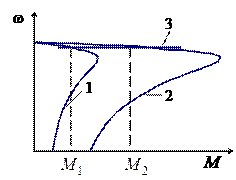 Рис. 4.4. Механические характеристики электропривода (кривые 1,2) и результирующая характеристика – 3 при наличии положительной обратной связи по току