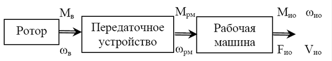 Основной функцией электропривода является приведение в движение рабочей машины в соответствии с требованиями технологического режима. Движение это совершается механической частью электропривода (МЧ ЭП), в состав которой входит ротор электродвигателя, передаточное устройство и рабочая машина (рис. 3.1). Приведенные на рис. 3.1 параметры обозначают Мв, Мрм, Мио – моменты на валу двигателя, рабочей машины, исполнительного органа; ωв, ωрм , ωио – угловые скорости вала ЭД, рабочей машины, исполнительного органа; Fио, Vио – усилие и линейная скорость исполнительного органа. В зависимости от вида передачи и конструкций рабочей машины различают (рис. 3.1): ЭП вращательного движения, обеспечивающий, соответственно, вращательное движение исполнительного органа РМ; выходные параметры – момент ИО механизма Мио и угло-вая частота вращения ωио; ЭП поступательного движения, обеспечивающий поступательное линейное движение ИО рабочей машины; выходные параметры – усилие Fио и линейная скорость Vио.