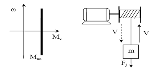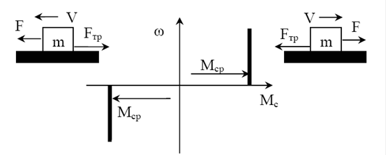 Отметим, что существует также специальный ЭП, называемый колебательным электроприводом, обеспечивающим возвратно-поступательное (вибрационное) движение (как угловое, так и линейное) исполнительного органа РМ. В механической части ЭП действуют различные виды усилий, моментов, различающиеся характером действия.Различают статические моменты реактивные Мср и активные Мса. Реактивные моменты создаются силой трения, силами сжатия, растяжения, кручения неупругих тел. Классическим примером здесь может служить сухое трение (рис. 3.2). Силы трения всегда противодействуют движению и при реверсе электропривода момент трения, обусловленный этими силами, также меняет направление, а функция Мс(ω) при скорости ω = 0 претерпевает разрыв. Силы трения проявляются в передачах электродвигателя и рабочих машинах. Активные (потенциальные) моменты создаются силой тяжести, силами сжатия, растяжения, кручения упругих тел. В МЧ ЭП активные моменты возникают в нагруженных элементах (валы, зубчатые зацепления и т.п.) при их деформации, поскольку механические связи не являются абсолютно жесткими. Особенности действия потенциальных моментов наглядно проявляются на примере силы тяжести. При подъеме или спуске груза направление силы тяжести Fj остается постоянным. Иными словами, при реверсе электропривода направление активного момента Мса сохраняется неизменным (рис. 3.3).
