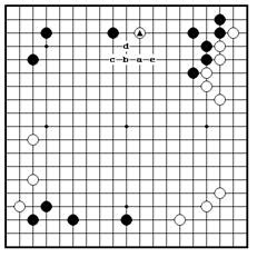 Первое, что вы должны сделать, когда встречаетесь лицом к лицу с этой ситуацией, это представить себе ясную цель и наметить что вы хотите сделать. Бессмысленно для черных пытаться убить этот камень. Разумнее позволить им выжить, но ограничить их сверху. Если держать эту цель в уме, то ч.”C” не подходит, так как белые могут прыгнуть на “A” и их камни не поймаешь. Диагональный ход ч.”D” также не отвечает их цели, так как белые могут убежать, играя в “E”. А как насчет накрывающего хода в “A”? Это накрывание является разновидностью строгого атакующего хода, который часто приводит к успеху. Белые сейчас могут бежать только с помощью диагонального хода в “D”. Черные камни слева будут усиливаться и уверенно получать территорию. Но белые могут убежать в центр, и черная стенка справа не будет использоваться эффективно. Таким образом, остается только коневой ход в “B”. Он будет гнать белые камни на черную стену, позволяя черным построить внешнюю стенку и заставляя белых выживать в готэ.