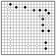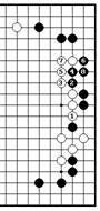 Проблема 13. Правильный ответБ.1 не дает черным соединиться со своими камнями снизу. Если - ч.2, белые играют сверху 3, а черные тянуться снизу 4. Сейчас б.5 является ключевой точкой, заставляющий черных защититься 6, но белые ловят черные камни коневым ходом 7. Так как б.1 находится в ключевой точки, у черных нет шансов сделать два глаза.