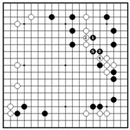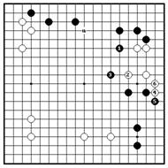 Проблема 13. Фальшивка Проблема 13. Вариант Проблема 13. Дзесэки После ч.4 на диа. Вместо попытки выжить на Если есть черный правильного ответа, белые стороне, черные могут маркированный камень, не должны играть 1 сюда. сыграть на внешней стороне то ч.1 начинает дзесэки Черные будут играть ханэ 2 в 1. Но после б.2 и 4, черные середины игры. После и соединяются со своими получают три тяжелых б.2, ч.3 или “a” камнями наверху ходами камня, которые могут быть являются дзесэки 2-8. Вторжение черных легко атакованы. ходами. прошло успешно.