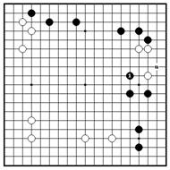 Проблема 14. Фальшивка Ч.1 и 3 атакуют из неправильного направления. Цель черных – Построить мое на верхней стороне, Но белые стабилизируют свои камни Вариантом до 6, оставляя позицию черных в нижнем правом углу тонкой. Далее, белые могут нацелиться на удар в “a”, чтобы уменьшить черное мое.