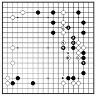 Проблема 15. Правильный ответПроблема 15. Вариант Сначала черные играют нозоки 1, а На ч.3 белые могут немедленно затем вставляют удар 3 для того, прыгать на 4. Вариант продолжается чтобы разделить белых на две части. до б.8, но черные атакуют белую Если б.4, черные удлиняются на 5, группу на верху, прилипая в 9. Если оставляя белых разделенными и б.8 играют на “a”, черные все равно безглазыми группами. Если белые будут прилипать 9. Если черные попытаются спасти одну из них, хотят более сильно атаковать белую другая - упадет. группу справа, они могут навалиться на нижнюю белую группу снизу с помощью форсированного хода на “b”.