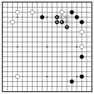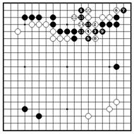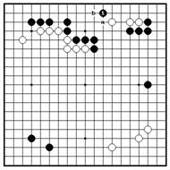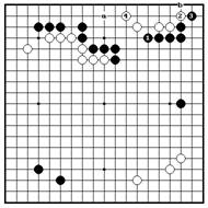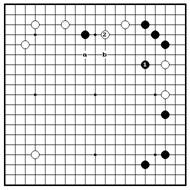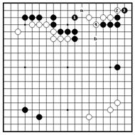 Ч.1 по 2-й линии – главнвя точка, Если белые пытаются убежать 2, которая угрожает базе белых. Более черные держат их 3 и 5. Вариант того, так как черные камни сильные, продолжается до б.14, и черные белые не могут легко убежать в центр. начинают ко ходом 15. Белые не Если белые играют в “a”, черные имеют ко угроз, поэтому черные удлиняться на “b”. захватывают все белые камни.