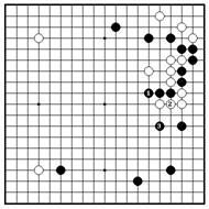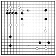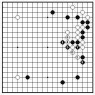 Проблема 66. Правильный ответЧерные должны играть форсированные ходы 1-5. После б.6 черные накрывают 7 и два белых камня на левой стороне попадают под атаку.
