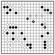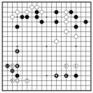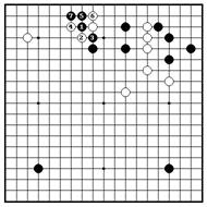Если белые играют ханэ с внешней Б. могут сыграть 2 и 4, но Ч. режут 5. стороны 2, черные режут на 3. Белые Если Б. жертвуют два камня , играя камни – слишком слабые, чтобы 6 и 8, Ч. снимают их 9 и доминируют начинать борьбу здесь и их позиция наверху. Далее, точки “a” и “b” будут разваливается после ч.7. миаи.