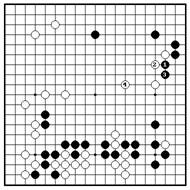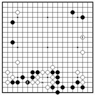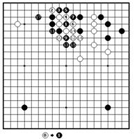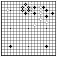 Черные гонят белых на свою плотность коневыми ходами 1 и 3. После 6 белые вероятно будут жить, но черные получают влияние в центре, достигая огромного преимущества наверху. Сейчас черные используют свое преимущество для вторжения на 7. Белые расширятся на 10, но черные играют в главную точку 11, затем ограничивают белые камни наверху ходами 13 и 15. Белые будут жить в готэ, но на атаке черные будут способны укрепить свой угол. Получив сентэ, черные следущим ходом сыграют в “a”.