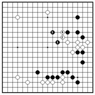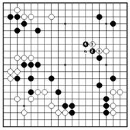 Если Б. проталкиваются 1 и 3, В партии Б. вынуждают 1 и 3,затем двойное ханэ 2 и 4 является прыгают 5. Ч. укрепляют угол 6, затем суровыми ходами. Простое намечают мое 8 и 10. Отметим, что ходы удлинение на “a” ходом 4 – также белых не дают им территории, в то время хорошо и это этот ход избегает Ч. расширили свое мое и укрепили угол. осложнений.