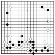 Черные будут первыми играть вынуждающий ход 1 для избежания разрезания, затем прыгают в центр на 3. Черные камни – уязвимы, но нет хорошего способа атаковать их. Поэтому, Белые, получив возможность, просто занимают большую точку на правой стороне 4. Б.1 на диа. правильного ответа не только вышибает базу черным, но также дает белым два глаза. Например, если черные атакуют с помощью варианта ч.”a” – б. “b” – ч.“c”, то белые играют в “d” и они живут.