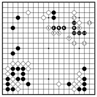 Проблема 90. Продолжение Белые играют ханэ 1 и устанавливают свои камни ходами 2-18. Однако, багодаря этому, черные получают крепкий левый нижний угол и их камни наверху сейчас вне опасности. После этого черные занимают большие точки 19 и 21 и партия складывается явно в их пользу.